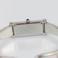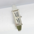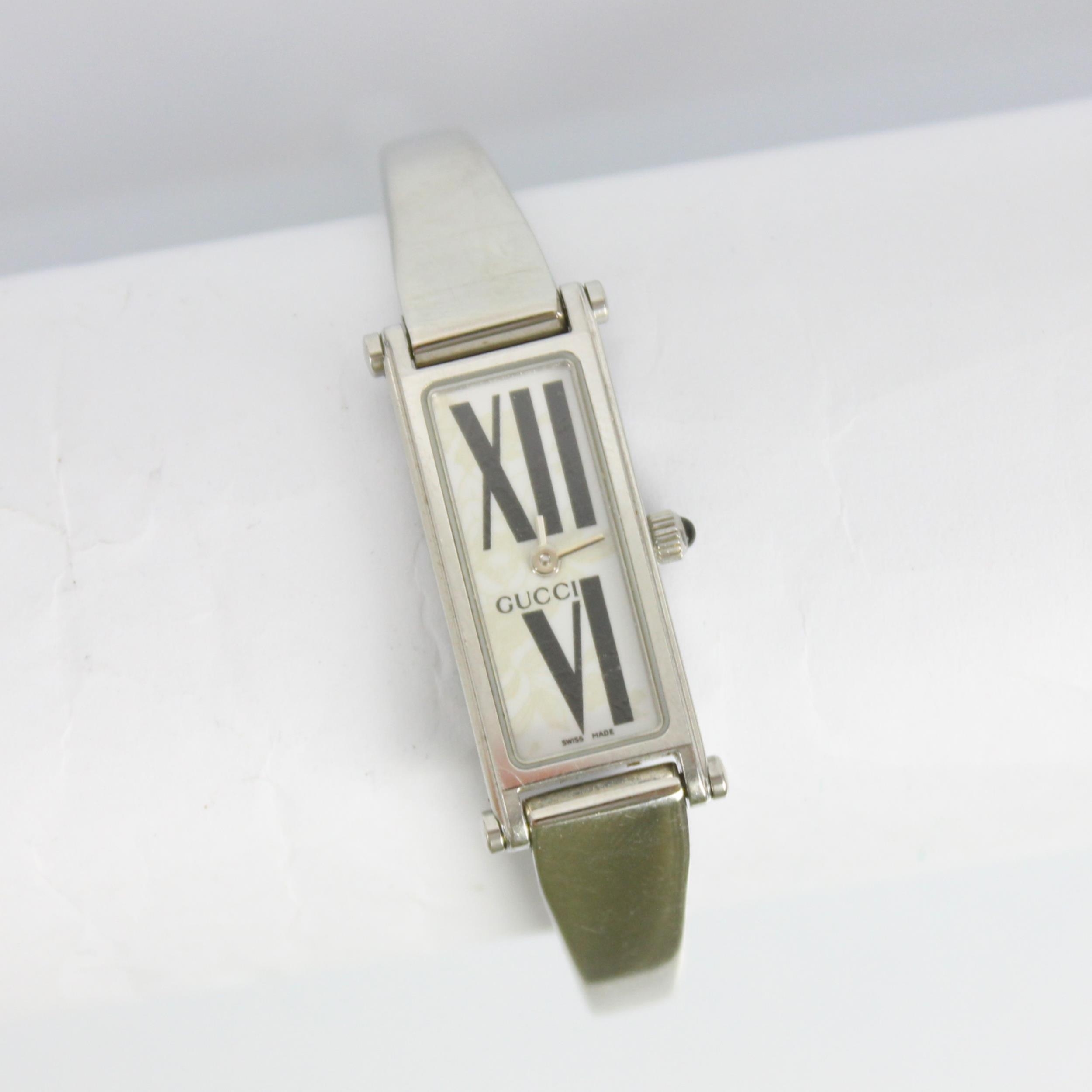 A Gucci stainless steel dress watch, REF 1500L, the rectangular dial with Roman numerals, set to plain polished case, 3cm long, upon Gucci bangle, stamped to reverse, approx 6cm wide, gross weight 27gms (including bracelet and movement)