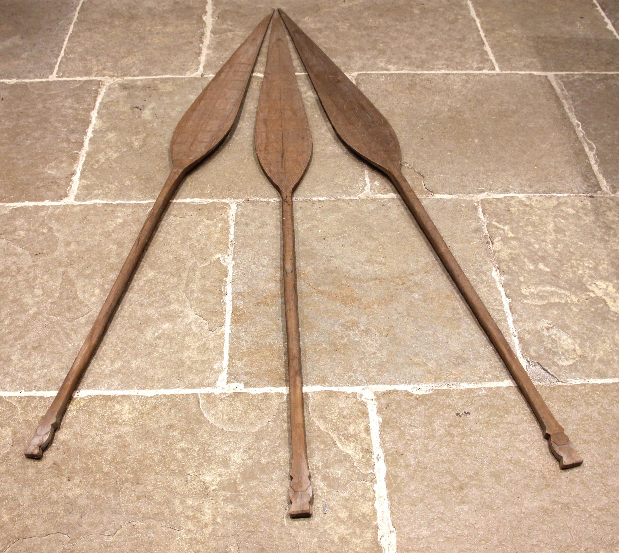 Three Tribal Oceanic paddles, 20th century, each shaft handle leading to a leaf shaped terminal with traditional geometric carved motifs, 193cm long, with a metal spear, 168cm long (4)