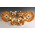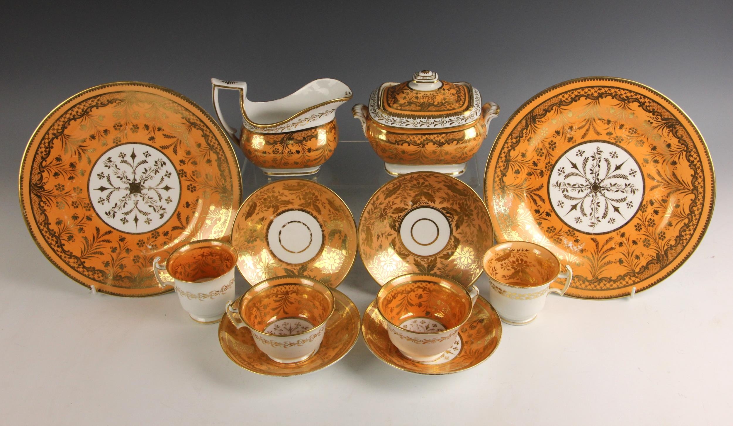 A 19th century English part coffee service, possibly Flight, Barr & Barr, comprising a pair of serving plates 24cm diameter, a sucrier and cover 16cm wide, a milk jug 9.5cm high, slop bowl 16.5cm diameter, eleven coffee saucers, ten tea saucers, two teacups, six coffee cups, each piece elaborately printed with gilt stencils against an orange ground (Qty) (at fault)