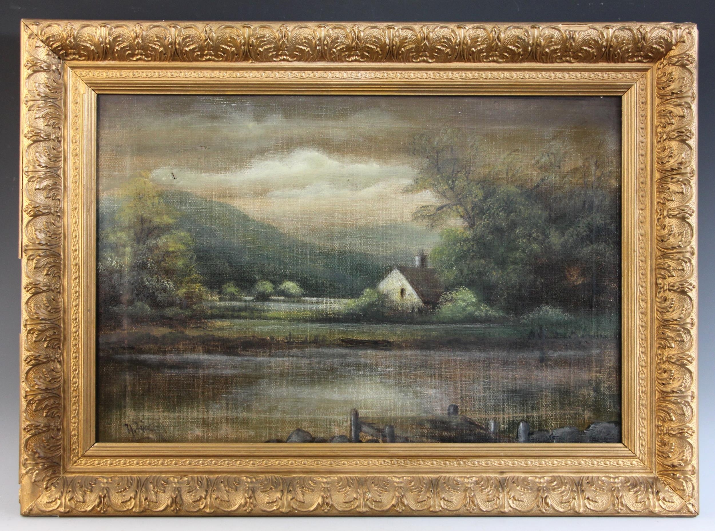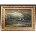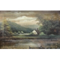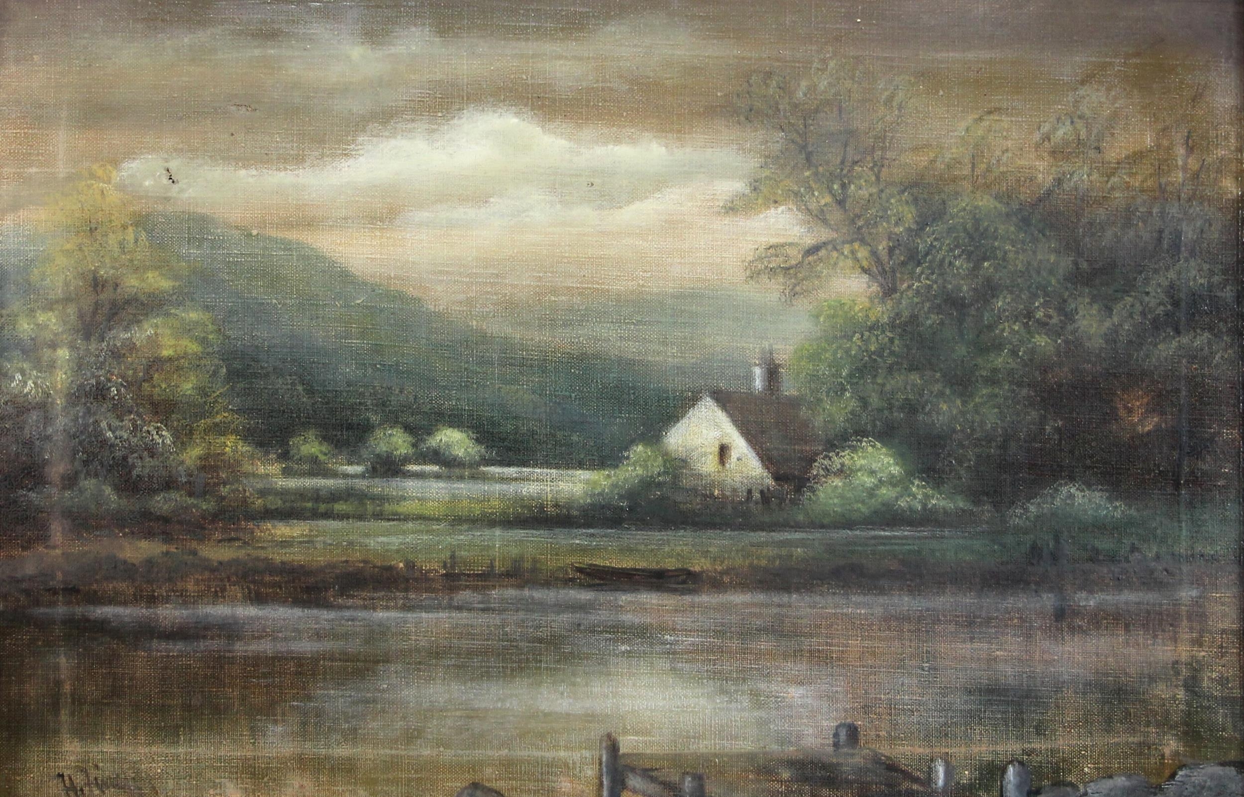 A river landscape with jetty and cottage beyond,