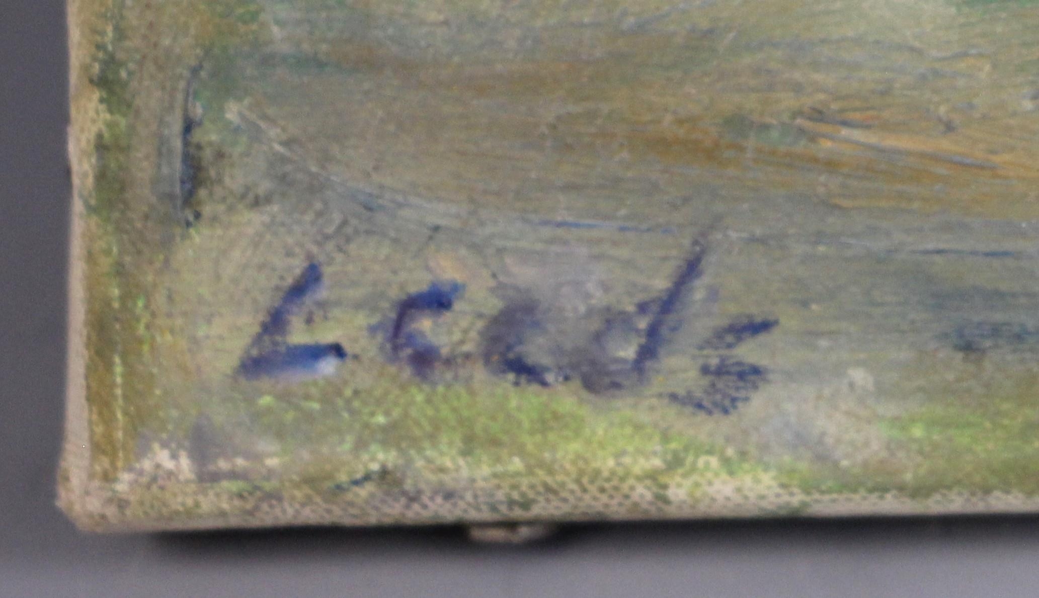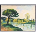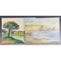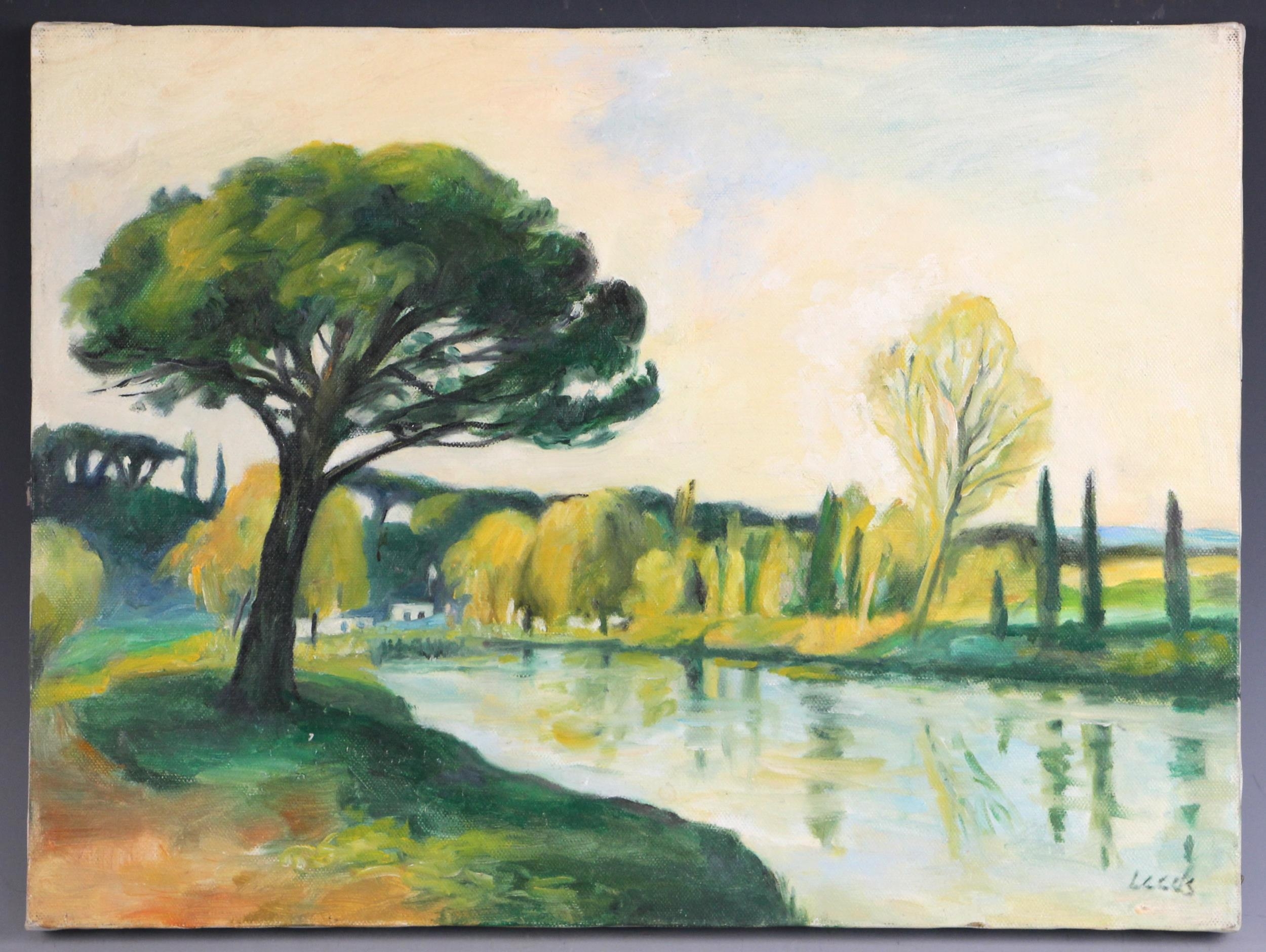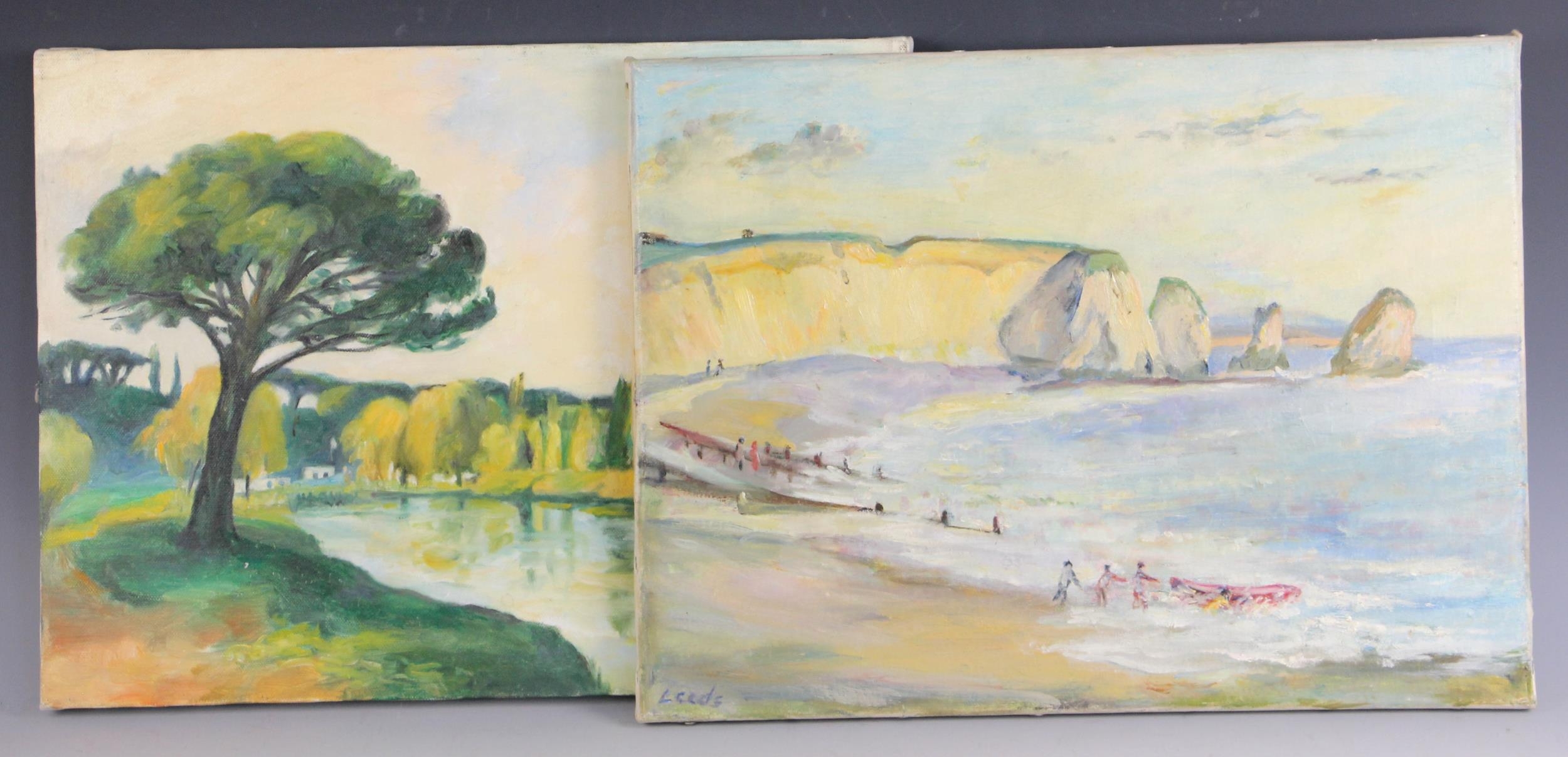 With two further oil on canvas landscapes by the same hand, a river scene and a coastal scene, each 30cm x 40.5cm, both unframed (3)