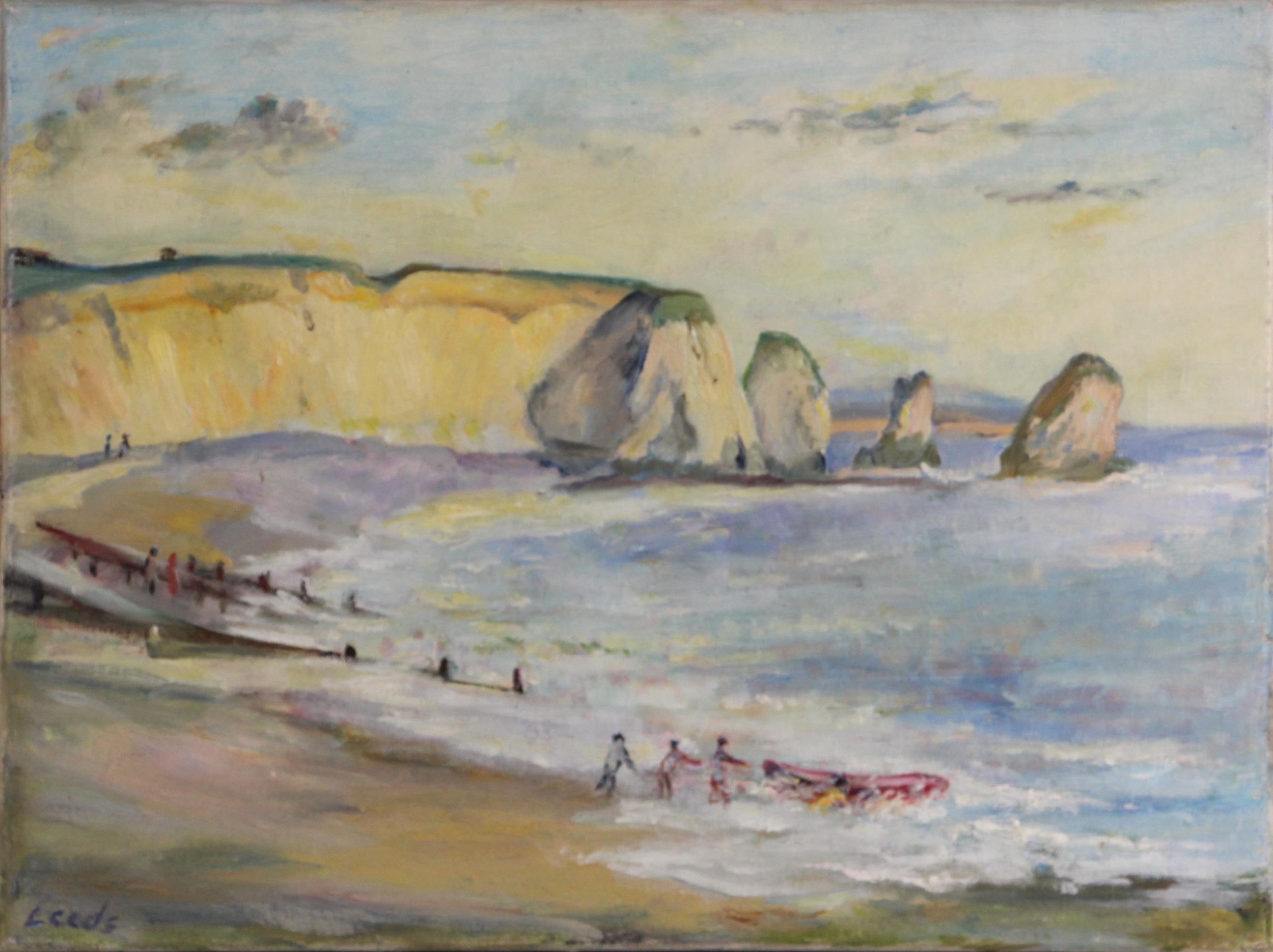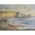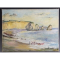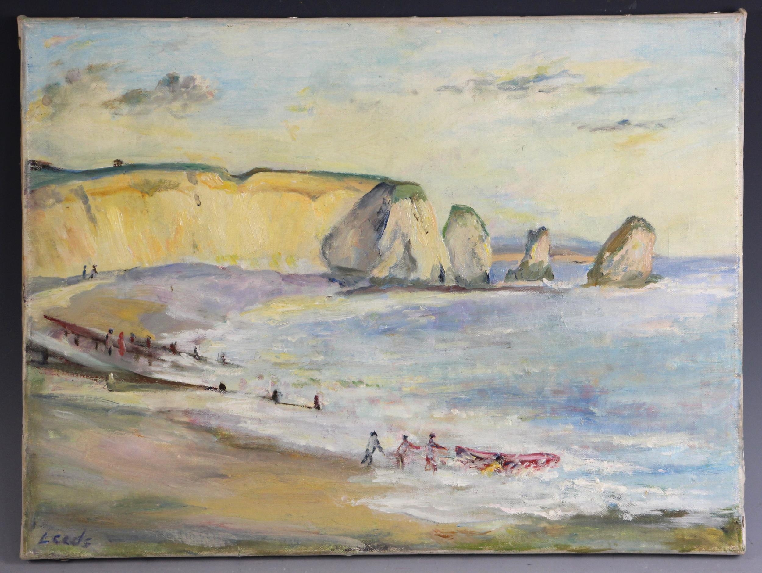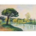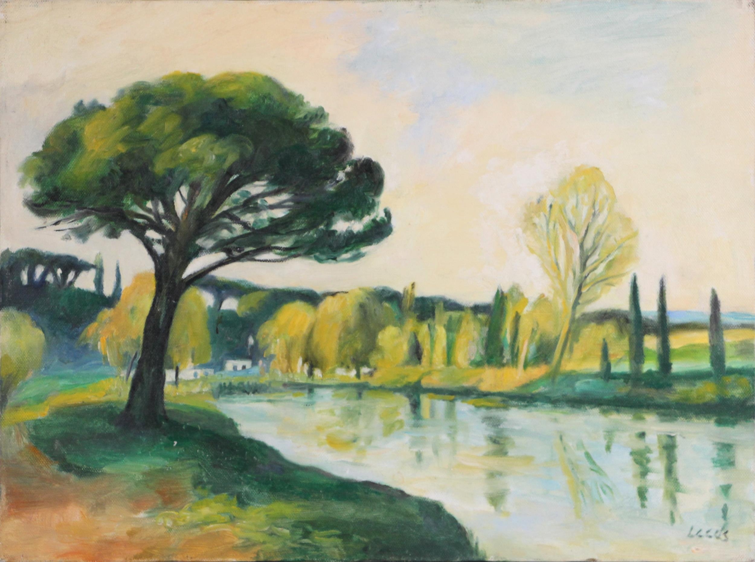 With two further oil on canvas landscapes by the same hand, a river scene and a coastal scene, each 30cm x 40.5cm, both unframed (3)